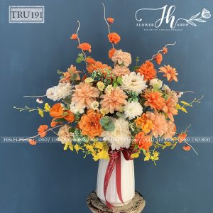 - Chất liệu: Hoa lụa cao cấp, bình sứ Bát Tràng