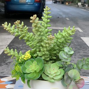 Bình tiểu cảnh sen đá HH70CX có những cành sen đá chuỗi ngọc vươn dài kết hợp cùng sen đá xanh và hoa lá điểm sống động. Chất liệu làm nên sen đá là silicon cao cấp tạo cho cây độ cứng cáp và màu xanh bóng giống sen đá thật.