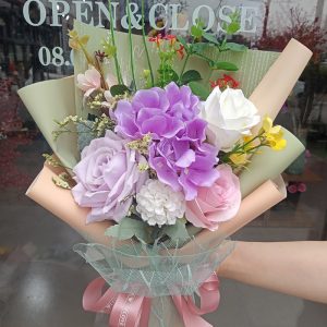 Bó hoa lụa HH64BH kết hợp hoa hồng và cẩm tú cầu, nổi bật và quyến rũ với tone màu tím. Hoa được làm từ lụa cao cấp, màu sắc sống động và tươi tắn, độ bền cao.