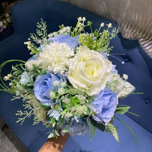 Bó hoa cưới cầm tay cô dâu HH17SK có sắc trắng tinh khôi tượng trưng cho tình yêu thuần khiết và một khởi đầu mới tốt đẹp, bên cạnh sắc xanh hoa hồng ngụ ý cho sự chung thủy và tình yêu bất diệt. H&H Flower tin rằng mỗi cô dâu đều mong muốn cầm trên tay bó hoa cưới lung linh và ý nghĩa như vậy. Với bó hoa lụa tuyệt vời của chúng tôi, không còn nỗi lo lắng hoa cưới qua thời gian trở nên biến màu kém tươi.