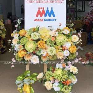 - Chất liệu: Hoa lụa cao cấp, kệ gỗ (giá chưa bao gồm bảng in)