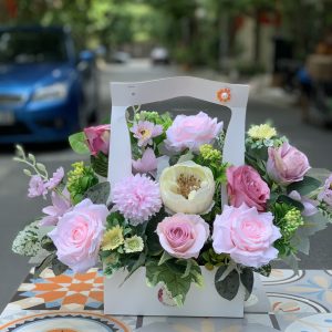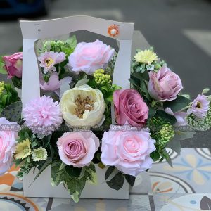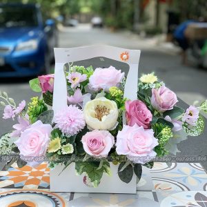 Hoa hồng phớt nhẹ nhàng kết hợp với hoa trà duyên dáng, thược dược hồng quyến rũ đã tạo nên một lẵng hoa trang trí độc đáo.
